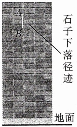 (2)由图可知$h_{AB}$近似为两块砖的厚度,$h_{AB}=12$cm = 0.12 m,$h_{OB}=h_{OA}+h_{AB}=1.92$m,$h_{OB}=\frac{1}{2}gt_{B}^{2}$,$t_{B}=\sqrt{\frac{2h_{OB}}{g}} = 0.62$s,曝光时间$\Delta t = t_{B}-t_{A}=0.02$s。 另解:由于$h_{AB}$很小,因此石子从A到B的速度变化很小,可以忽略不计,故曝光时间$\Delta t=\frac{h_{AB}}{v_{A}} = 0.02$s。