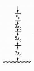 (2)由自由落体运动规律$x_{0}=\frac{1}{2}gT^{2}$,解得滴水的时间间隔为$T=\sqrt{\frac{2x_{0}}{g}}=\sqrt{\frac{2×0.2}{10}}$s = 0.2 s。 解法3:用平均速度求解 设滴水的时间间隔为T,则水滴经过窗子过程中的平均速度为$\overline{v}=\frac{x'}{T}=\frac{1}{T}$。 由$v_{t}=gt$知,水滴下落2.5T时的速度为$v_{t}=2.5gT$,由于$\overline{v}=v_{t}$,故有$\frac{1}{T}=2.5gT$,解得T = 0.2 s,则屋檐高度$h=\frac{1}{2}g(4T)^{2}=3.2$m。