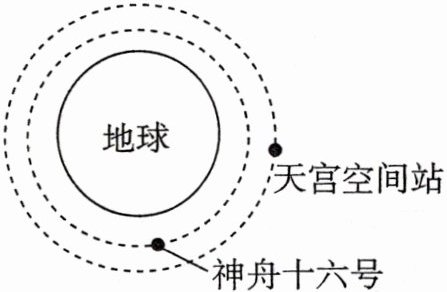 BC 对接前,神舟十六号与天宫空间站绕地球做圆周运动的方向相同,选项 A 错误;由万有引力提供向心力可知$G\frac{Mm}{r^{2}} = m\frac{v^{2}}{r}$,解得$v = \sqrt{\frac{GM}{r}}$,所以对接前,神舟十六号绕地球做圆周运动的线速度大小比天宫空间站的大,选项 B 正确;由图可知,对接前,神舟十六号的轨道半径小于天宫空间站的轨道半径,要想完成对接,需要神舟十六号加速做离心运动,则神舟十六号需要运动到天宫空间站后下方变轨才能实现对接,选项 C 正确,选项 D 错误。