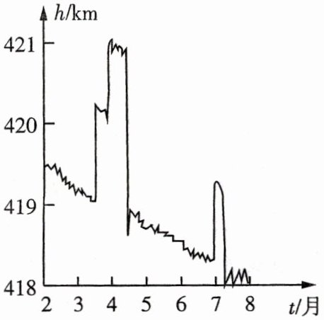 3.[2021 浙江 6 月]空间站在地球外层的稀薄大气中绕行,因气体阻力的影响,轨道高度会发生变化. 空间站安装有发动机,可对轨道进行修正. 图中给出了国际空间站在 2020.02 - 2020.08 期间离地高度随时间变化的曲线,则空间站 ( )