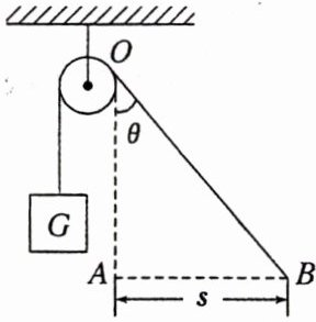 4. 如图所示,一辆拖车通过光滑定滑轮将一重为 $G$ 的物体匀速提升,当拖车从 $A$ 点水平移动到 $B$ 点时,位移为 $s$,绳子由竖直变为与竖直方向成 $\theta$ 角,求此过程中拖车对绳子所做的功.