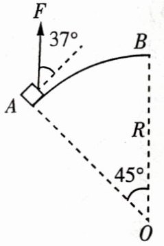 3. 如图所示,一质量为 $m = 2.0\ \text{kg}$ 的物体从半径为 $R = 5.0\ \text{m}$ 的圆弧轨道的 $A$ 端,在拉力作用下沿圆弧缓慢运动到 $B$ 端(圆弧 $AB$ 在竖直平面内). 拉力 $F$ 的大小始终为 $15\ \text{N}$,方向始终与物体所在圆弧处的切线成 $37^{\circ}$ 角. 圆弧轨道所对应的圆心角为 $45^{\circ}$,$BO$ 边沿竖直方向. 求这一过程中:($g$ 取 $10\ \text{m/s}^2$,$\sin37^{\circ}=0.6$,$\cos37^{\circ}=0.8$)