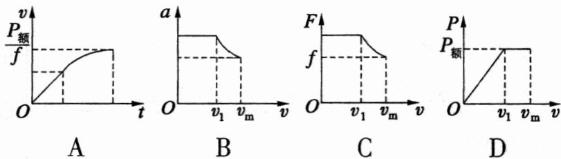 9.[多选]一辆轿车质量为$m$,在平直公路上行驶,启动阶段轿车牵引力保持不变,而后以额定功率继续行驶,经过一段时间,其速度由零增大到最大值$v_{m}$. 若所受阻力恒为$f$,则关于轿车的速度$v$、加速度$a$、牵引力$F$、功率$P$的图像可能正确的是 ( )