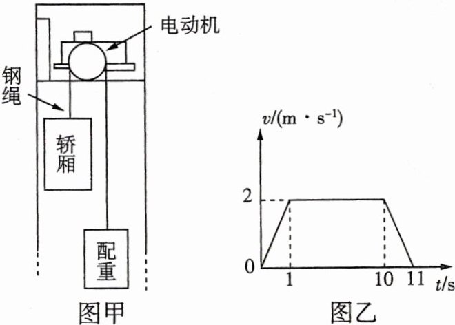 2. 电梯一般用电动机驱动,钢绳挂在电动机绳轮上,一端悬吊轿厢,另一端悬吊配重装置. 钢绳和绳轮间产生的摩擦力能驱使轿厢上下运动. 若电梯轿厢质量为$2\times10^{3}$kg,配重质量为$2.4\times10^{3}$kg. 某次电梯轿厢由静止开始上升的$v - t$图像如图乙所示,不计空气阻力,重力加速度$g$取 10 m/s². 下列说法正确的是 ( )