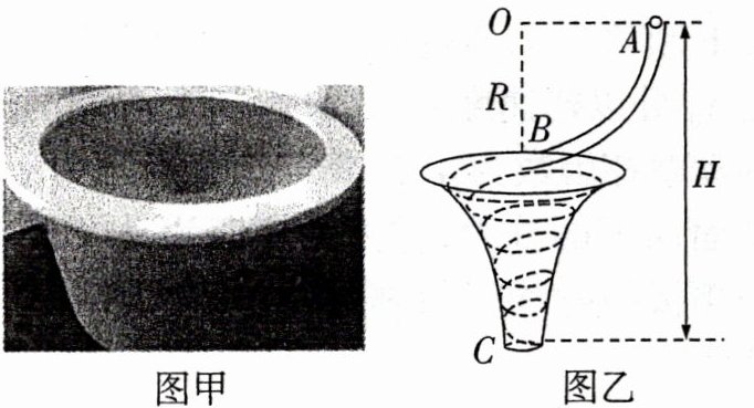 3. 在温州市科技馆中,有个用来模拟天体运动的装置,其内部是一个类似锥形漏斗容器,如图甲所示. 现在该装置的上方固定一个半径为 R 的$\frac{1}{4}$光滑管道 AB,光滑管道下端刚好贴着锥形漏斗容器的边缘,如图乙所示. 将一个质量为 m 的小球从管道的 A 点静止释放,小球从管道 B 端射出后刚好贴着锥形容器壁运动,且运动的高度越来越低,最后从容器底部的孔 C 掉下(轨迹大致如图乙虚线所示),已知小球离开 C 孔的速度为 v,A 到 C 的高度为 H,重力加速度为 g. 求:
