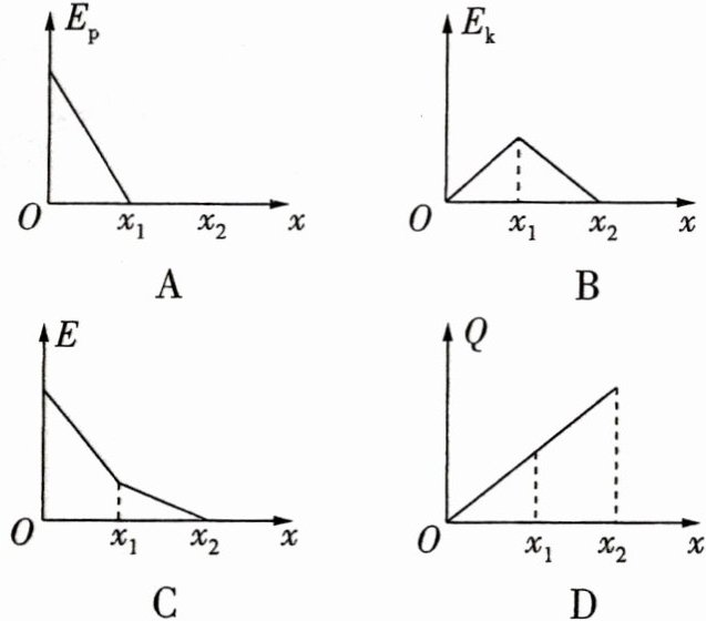 4.C 设动摩擦因数为$\mu$,斜面的倾角为$\theta$,小木块开始下滑位置到水平面的高度为H;小木块在斜面上运动时的重力势能为$E_{p}=mg(H - h)$,$h = xtan\theta$,解得$E_{p}=mgH - mgxtan\theta$,又小木块在水平面上运动时,$E_{p}=0$,A正确。木块在斜面上运动时,根据动能定理得$mgh-\mu mgscos\theta = E_{k}-0$,$h = xtan\theta$,$s=\frac{x}{cos\theta}$,解得$E_{k}=mgx(tan\theta - \mu)$,木块在水平面上运动时,设初动能为$E_{k0}$,根据动能定理得$-\mu mg(x - x_{1}) = E_{k}-E_{k0}$,解得$E_{k}=E_{k0}-\mu mg(x - x_{1})$,B正确。木块克服摩擦力做功转化为内能,木块在斜面上时,$Q=\mu mgscos\theta$,$s=\frac{x}{cos\theta}$,解得$Q=\mu mgx$,木块在水平面上运动时,$Q=\mu mg(x - x_{1})$,木块在斜面上运动和在水平面上运动,图像的斜率相同,D正确。木块在斜面上运动时,根据能量守恒定律得$E = mgh - Q$,$Q=\mu mgx$,解得$E = mgh - \mu mgx$,木块在水平面上运动时,设初始机械能为$E_{0}$,根据能量守恒定律得$E = E_{0}-\mu mg(x - x_{1})$,木块在斜面上运动和在水平面上运动,图像的斜率相同,C错误。