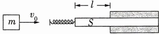 6.[多物体能量守恒/多选]如图所示为某缓冲装置的模型图,一轻杆 S 被两个固定薄板夹在中间,轻杆 S 与两薄板之间的滑动摩擦力均为 f,轻杆 S 露在薄板外面的长度为 l. 轻杆 S 前端固定一个劲度系数为$\frac{3f}{l}$的轻弹簧. 一质量为 m 的物体从左侧以速度$v_{0}$撞向弹簧,能使轻杆 S 向右侧移动$\frac{l}{6}$. 已知弹簧的弹性势能$E_{p}=\frac{1}{2}kx^{2}$,其中 k 为劲度系数,x 为弹簧的形变量. 最大静摩擦力等于滑动摩擦力,弹簧始终在弹性限度内. 下列说法正确的是 ( )