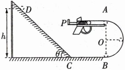 6.[含弹簧的多过程]如图所示为某弹射游戏装置图. 水平枪管中弹簧被弹射杆$P$用线拉着,处于压缩状态,质量为$m$的小球紧靠弹簧,枪口上边缘与半圆形光滑竖直轨道最高点$A$的内侧对齐. 水平轨道$BC$在$B$、$C$两点分别与半圆轨道内侧和倾角$\theta = 45^{\circ}$的倾斜轨道平滑连接. 扣动扳机,弹射杆$P$立即松开弹簧,小球射出经轨道到达斜面上$D$点时速度为零,后又恰好能回到$A$点进入枪内,挤压弹簧后再次被弹出. 已知半圆轨道半径为$R$,$BC$长$s = 2R$,小球与斜面$CD$、水平面$BC$间的动摩擦因数均为$\mu = 0.25$,重力加速度为$g$,小球受到的摩擦力视为滑动摩擦力. 求:
