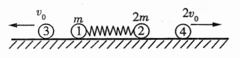 3.[动量守恒的临界极值问题/多选] 如图所示,四个小球放在光滑的水平面上,小球3和小球4分别以$v_0$和$2v_0$的速率向两侧匀速运动,中间两个小球静止,小球1的质量为$m$,小球2的质量为$2m$,1、2两球之间放置一被压缩的轻弹簧,弹簧所具有的弹性势能为$E_p$,将弹簧的弹性势能全部释放,下列说法正确的是 ( )