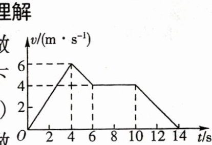 (1) v - t图线与时间轴所围图形的面积表示位移,因此质点在0~14 s内的位移为x = 4×6/2 m + (4 + 6)×2/2 m + 4×(10 - 6) m + 4×(14 - 10)/2 m = 46 m。