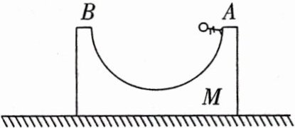 7.[“人船模型”的拓展/2024 云南曲靖模拟/多选]如图所示,一半圆槽滑块的质量为$M$,半圆槽半径为$R$,滑块静止在光滑水平桌面上,一质量为$m$的小型机器人(可视为质点)置于半圆槽的$A$端,在无线遥控器控制下,小型机器人从半圆槽$A$端移动到$B$端. 下列说法正确的是 ( )