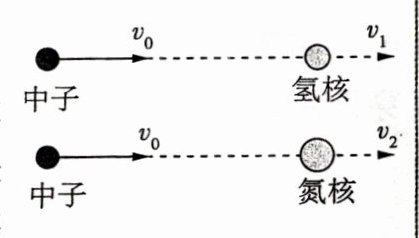 9.[2022 湖南]1932 年,查德威克用未知射线轰击氢核,发现这种射线是由质量与质子大致相等的中性粒子(即中子)组成. 如图,中子以速度$v_0$分别碰撞静止的氢核和氮核,碰撞后氢核和氮核的速度分别为$v_1$和$v_2$. 设碰撞为弹性正碰,不考虑相对论效应,下列说法正确的是 ( )