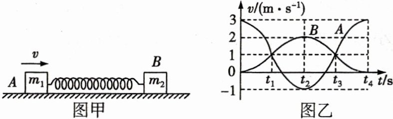 3.[滑块与弹簧连接/多选]如图甲所示,一个轻弹簧的两端与质量分别为$m_1$和$m_2$的两物块 A、B 相连接并静止在光滑的水平地面上. 现使 A 以 3 m/s 的速度向 B 运动压缩弹簧,速度 - 时间图像如图乙,则有 ( )