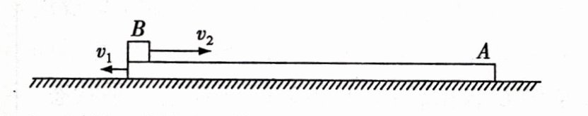 9.[滑块、滑板反向运动]质量为 $M = 1.0\ \text{kg}$的长木板 $A$在光滑水平面上以 $v_1 = 0.5\ \text{m/s}$的速度向左运动,某时刻质量为 $m = 0.5\ \text{kg}$的小木块 $B$以 $v_2 = 4\ \text{m/s}$的速度从左端向右滑上长木板,经过时间 $t = 0.6\ \text{s}$小木块 $B$相对 $A$静止,已知重力加速度 $g$取 $10\ \text{m/s}^2$,求: