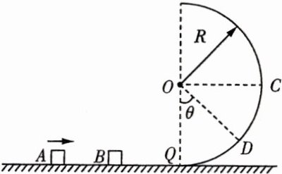 2.[三大观点的综合应用/2021 湖北]如图所示,一圆心为$O$、半径为$R$的光滑半圆弧轨道固定在竖直平面内,其下端与光滑水平面在$Q$点相切. 在水平面上,质量为$m$的小物块$A$以某一速度向质量也为$m$的静止小物块$B$运动. $A$、$B$发生正碰后,$B$到达半圆弧轨道最高点时对轨道压力恰好为零,$A$沿半圆弧轨道运动到与$O$点等高的$C$点时速度为零. 已知重力加速度大小为$g$,忽略空气阻力.