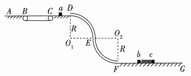 3.[三大观点的综合应用/2023 浙江 6 月]为了探究物体间的碰撞特性,设计了如图所示的实验装置. 水平直轨道$AB$、$CD$和水平传送带平滑无缝连接,两半径均为$R = 0.4$m 的四分之一圆周组成的竖直细圆弧管道$DEF$与轨道$CD$和足够长的水平直轨道$FG$平滑相切连接. 质量为$3m$的滑块$b$与质量为$2m$的滑块$c$用劲度系数$k = 100$N/m 的轻质弹簧连接,静置于轨道$FG$上. 现有质量$m = 0.12$kg 的滑块$a$以初速度$v_{0} = 2\sqrt{21}$m/s 从$D$处进入,经$DEF$管道后,与$FG$上的滑块$b$碰撞(时间极短). 已知传送带长$L = 0.8$m,以$v = 2$m/s 的速率顺时针转动,滑块$a$与传送带间的动摩擦因数$\mu = 0.5$,其他摩擦和阻力均不计,各滑块均可视为质点,弹簧的弹性势能$E_{p}=\frac{1}{2}kx^{2}$($x$为形变量).