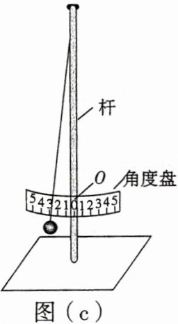 (2)单摆实验的装置示意图如图(c)所示,其中角度盘需要固定在杆上的确定点$O$处,摆线在角度盘上所指的示数为摆角的大小. 若将角度盘固定在$O$点上方,则摆线在角度盘上所指的示数为$5^{\circ}$时,实际摆角______$5^{\circ}$(填“大于”或“小于”).
