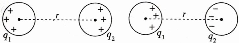 图甲:同种电荷,$F < k\frac{q_{1}q_{2}}{r^{2}}$ 图乙:异种电荷,$F > k\frac{q_{1}q_{2}}{r^{2}}$