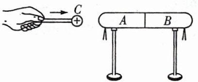 2 取一对用绝缘柱支持的导体$A$和$B$,使它们彼此接触. 起初它们不带电,贴在下部的两片金属箔是闭合的,手握绝缘棒,把$C$移近导体$A$.