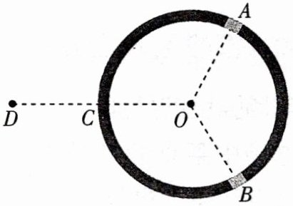 12.[等效法/2022 山东]半径为$R$的绝缘细圆环固定在图示位置,圆心位于$O$点,环上均匀分布着电荷量为$Q$的正电荷. 点$A$、$B$、$C$将圆环三等分,取走$A$、$B$处两段弧长均为$\Delta L$的小圆弧上的电荷. 将一点电荷$q$置于$OC$延长线上距$O$点为$2R$的$D$点,$O$点的电场强度刚好为零. 圆环上剩余电荷分布不变,$q$为 ( )