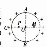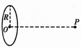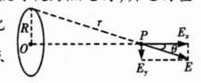 11.$\frac{kQl}{(R^{2}+l^{2})^{\frac{3}{2}}}$,方向由O指向P 解析:若将圆环分成n小段,则每一小段可视为点电荷,其电荷量为q = $\frac{Q}{n}$,这样就把非理想化模型转化为了理想化模型,每一个点电荷在P点产生的场强大小为E = $\frac{kQ}{nr^{2}}$ = $\frac{kQ}{n(R^{2}+l^{2})}$。如图所示,根据对称性可知,每一个点电荷在P点产生的场强在垂直于OP方向的分量Eᵧ、E_{z}(未画出)都会被抵消,又Eₓ = Ecosθ = $\frac{kQ}{n(R^{2}+l^{2})}$·cosθ = $\frac{kQ}{n(R^{2}+l^{2})}$·$\frac{l}{\sqrt{R^{2}+l^{2}}}$ = $\frac{kQl}{n(R^{2}+l^{2})^{\frac{3}{2}}}$,所以P点的场强E_{P} = nEₓ = $\frac{kQl}{(R^{2}+l^{2})^{\frac{3}{2}}}$,方向由O指向P。