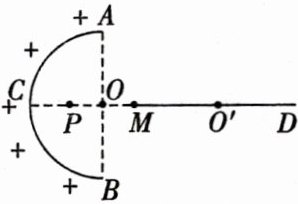 10.[填补法、对称法]如图所示,正电荷$q$均匀分布在半球面$ACB$上,球面半径为$R$,$CD$为通过半球面顶点$C$和球心$O$的轴线. $P$、$M$为轴线上的两点,距球心$O$的距离均为$\frac{R}{2}$. 在$M$右侧轴线上$O'$点固定一带正电的点电荷$Q$,$O'$、$M$点间的距离为$R$,已知$P$点的场强为零,若均匀带电的封闭球壳内部电场强度处处为零,则$M$点的场强大小为 ( )