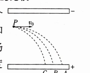 10.[多选]如图所示,有三个质量相等,分别带正电、负电和不带电的小球,从平行板电场中的$P$点以相同的水平初速度垂直于电场方向进入电场,它们分别落在$A$、$B$、$C$三点,则可判断 ( )