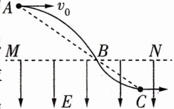 8.[电场和重力场组合下的偏转/多选]如图所示,在真空中,水平面$MN$的$A$点下方存在竖直向下的匀强电场,质量为$m$的带电小球由$MN$上方的$A$点以一定初速度$v_{0}$水平抛出,从$B$点进入电场,到达$C$点时速度方向恰好水平. 已知$A$、$B$、$C$三点在同一直线上,且$AB = 2BC$,重力加速度为$g$,则 ( )