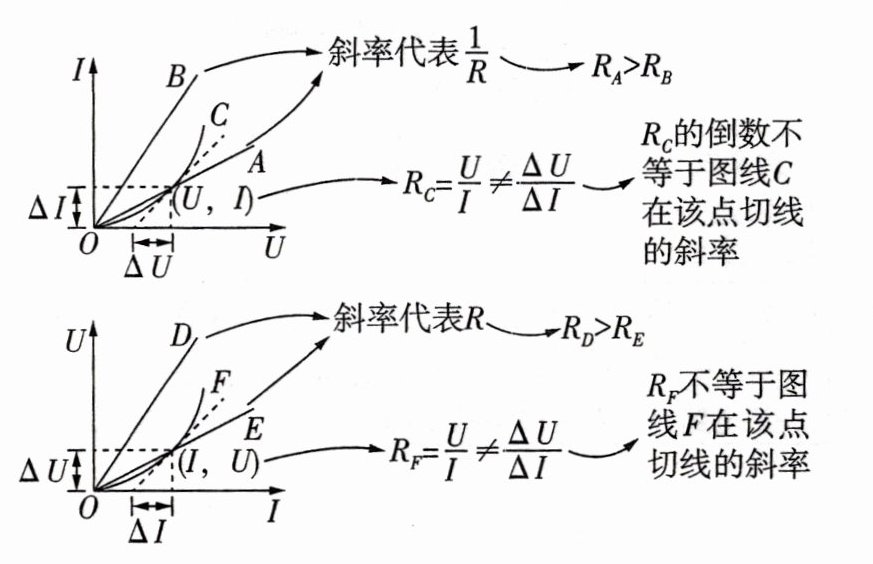 说明 图线$A、B、D、E$表示线性元件的关系图,$C、F$表示非线性元件的关系图. 对于线性元件有$R = \frac{U}{I} = \frac{\Delta U}{\Delta I}$,对于非线性元件有$R = \frac{U}{I} \neq \frac{\Delta U}{\Delta I}$.