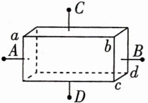 5.如图所示,质地均匀的长方体金属块,棱长$l_{ab} = 10\ cm$,$l_{bc} = 5\ cm$,当将$C$与$D$接入电压恒为$U$的电路时,电流为$2\ A$,若将$A$与$B$接入电压恒为$U$的电路中,则电流为 ( )