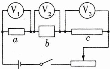 7.[串联电路的分析]如图所示,$a$、$b$、$c$为由同种材料制成的电阻,$b$与$a$的长度相等但横截面积是$a$的两倍;$c$与$a$的横截面积相等但长度是$a$的两倍. 开关闭合后,三个理想电压表的示数关系是 ( )