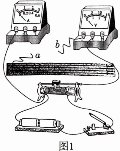 (1)测量一段金属丝电阻时所用器材和部分电路连线如图 1 所示,图中的导线$a$端应与______(选填“ - ”“0.6”或“3”)接线柱连接,$b$端应与______(选填“ - ”“0.6”或“3”)接线柱连接. 开关闭合前,图 1 中滑动变阻器滑片应置于______(选填“左”或“右”)端.