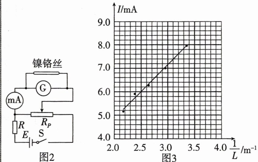 则$I - \frac{1}{L}$图像斜率$k =$______mA·m. 若要把该表头$G$改装成量程为 9 mA 的电流表,需要把长为______m 的镍铬丝并联在表头$G$两端.(结果均保留 2 位有效数字)