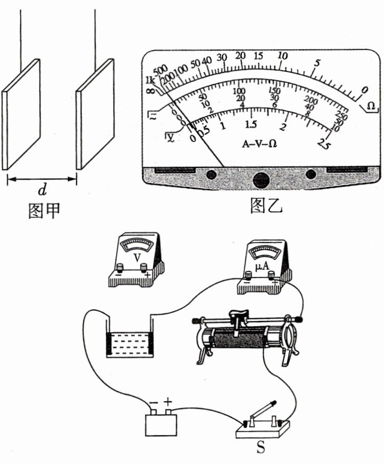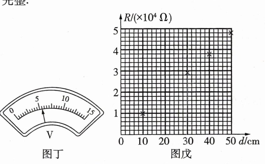 (3)某次测量过程中,两个铂片间距$d = 20$ cm,测量时电流表读数为$I = 275$ μA,电压表指针偏转如图丁所示,电压表读数为$U =$______V,则该溶液电阻$R =$______Ω(结果保留 2 位有效数字).