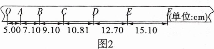 (2)甲同学安装并调整好实验器材. 接通电源后, 让拖着纸带的小车沿长木板运动, 重复几次, 打出若干条纸带. 从中选出了如图 2 所示的一条纸带并确定出 $O、A、B、C、\cdots$ 计数点(相邻计数点间还有 4 个计时点没有标出), 图中标出了相邻计数点之间的距离.