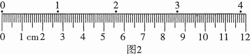 (2)经正确操作后打出一条纸带, 截取其中一段如图 2 所示. 选取连续打出的点 0、1、2、3、4 为计数点, 则计数点 1 的读数为 cm. 已知打点计时器所用交流电源的频率为 50 Hz, 则打计数点 2 时小车的速度大小为 m/s(结果保留 3 位有效数字).