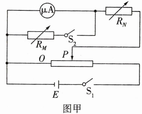 (6)某次半偏法测量表头内阻的实验中,$S_{2}$断开,电表满偏时读出$R_{N}$的值,在滑片$P$不变的情况下,$S_{2}$闭合后调节电阻箱$R_{M}$,使电表半偏时读出$R_{M}$,若认为$O、P$间电压不变,则微安表内阻为______(用$R_{M}、R_{N}$表示).