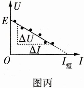 ||图像法:若采用图甲电路,电压表的分流作用造成误差,电压表的示数越大,电压表的分流越多,对应的 $I_{真}$ (即干路电流) 与 $I_{测}$ (即电流表的示数) 的差越大,$I_{真}-I_{测}=I_{V}=\frac{U}{R_{V}}$. 若电表为理想电表,则 $U - I$ 图像如图乙所示