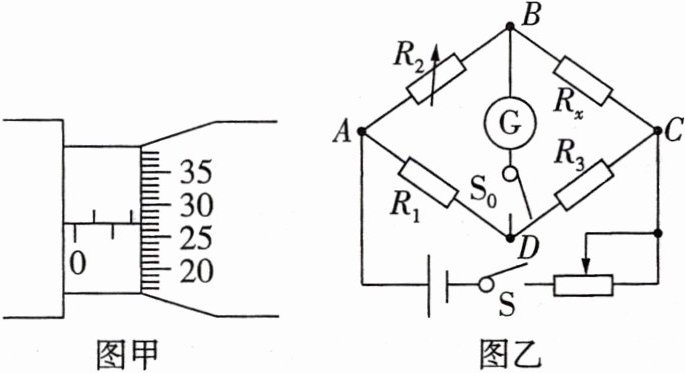 (3)用图乙所示的电路测量金属丝的电阻$R_{x}$、电路中$R_{1}、R_{3}$为阻值未知的定值电阻,$R_{2}$为电阻箱.