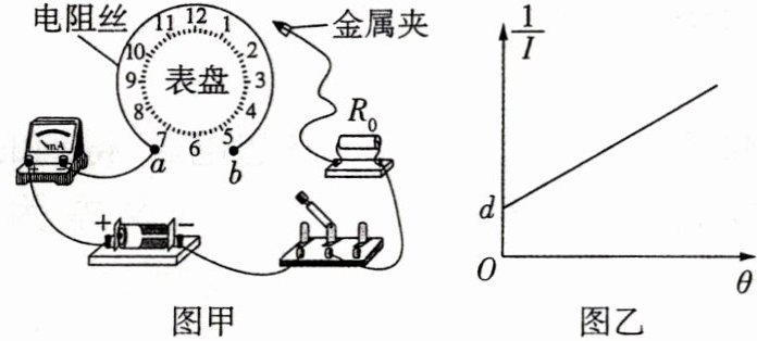 (4)整理数据并在坐标纸上描点绘图,所得图像如图乙所示,图线斜率为 $k$,纵轴截距为 $d$,设单位角度对应的电阻丝的阻值为 $r_{0}$,该电池的电动势和内阻可表示为 $E =$______, $r =$______.(用 $R_{0}、R_{A}、k、d、r_{0}$ 表示)