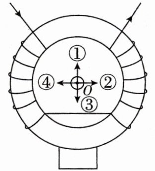 4. [2024 湖北荆州模拟] 铁环上绕有带绝缘皮的通电导线,电流方向如图所示,若在铁环中心$O$点处放置垂直纸面的电流元,电流方向向外,则电流元受到的安培力方向为 ( )