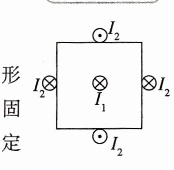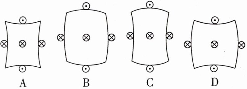 3. [2021 广东] 截面为正方形的绝缘弹性长管中心有一固定长直导线,长管外表面固定着对称分布的四根平行长直导线. 若中心直导线通入电流$I_1$,四根平行直导线均通入电流$I_2$,$I_1\gg I_2$,电流方向如图所示. 下列截面图中可能正确表示通电后长管发生形变的是 ( )