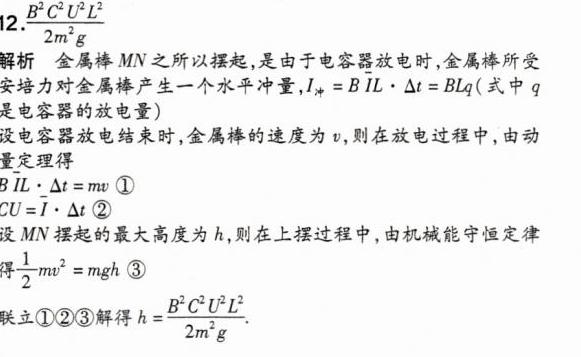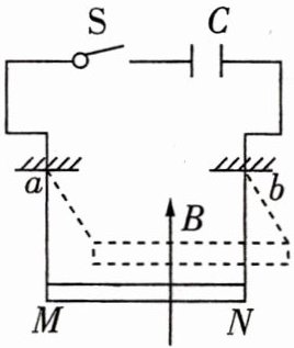 12. 如图所示,质量为 $m$,长为 $L$ 的金属棒 $MN$,通过两根柔软的轻质导线悬挂于 $a$、$b$ 两点,$a$、$b$ 间接有电压为 $U$、电容为 $C$ 的电容器,整个装置处于磁感应强度大小为 $B$,方向竖直向上的匀强磁场中,接通 $S$,电容器瞬间完全放电后又断开 $S$,已知重力加速度为 $g$. 求 $MN$ 能摆起的最大高度.