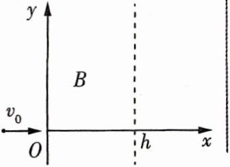 12.如图,在$0\leqslant x\leqslant h$,$-\infty < y < +\infty$区域中存在方向垂直于纸面的匀强磁场,磁感应强度$B$的大小可调,方向不变. 一质量为$m$、电荷量为$q(q > 0)$的粒子以速度$v_{0}$从磁场区域左侧沿$x$轴进入磁场,不计重力.