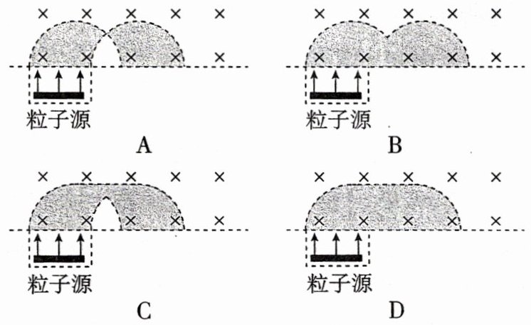 1. 如图所示,一线状粒子源垂直于磁场边界不断地发射速度相同的同种带电粒子,不考虑粒子间的相互作用,则粒子经过磁场的区域(阴影部分)可能是 ( )