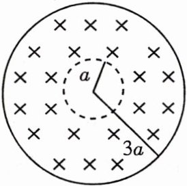 3.真空中有一匀强磁场,磁场边界为两个半径分别为 $a$ 和 $3a$ 的同轴圆柱面,磁场的方向与圆柱轴线平行,其横截面如图所示. 一速率为 $v$ 的电子从圆心沿半径方向进入磁场. 已知电子质量为 $m$,电荷量为 $e$,忽略重力. 为使该电子的运动被限制在图中实线圆围成的区域内,磁场的磁感应强度最小为 ( )
