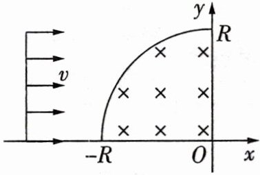4. 如图所示,半径为$R$的$\frac{1}{4}$圆形区域内存在着垂直纸面向里的匀强磁场,磁感应强度大小为$B$,磁场的左边垂直$x$轴放置一线形粒子发射装置,能在$0\leqslant y\leqslant R$的区间内各处沿$x$轴正方向同时发射出速度相同、带正电的同种粒子,粒子质量为$m$、电荷量为$q$,不计粒子的重力及粒子间的相互作用力,若某时刻粒子被装置发射出后,经过磁场偏转击中$y$轴上的同一位置,则下列说法中正确的是 ( )