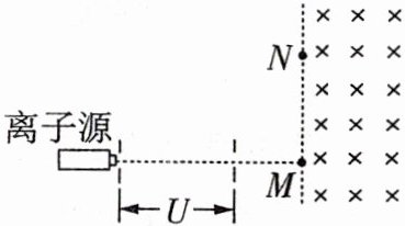 1.如图,从离子源产生的甲、乙两种离子,由静止经加速电压$U$加速后在纸面内水平向右运动,自$M$点垂直于磁场边界射入匀强磁场,磁场方向垂直于纸面向里,磁场左边界竖直. 已知甲种离子射入磁场的速度大小为$v_{1}$,并在磁场边界的$N$点射出;乙种离子在$MN$的中点射出;$MN$长为$l$. 不计重力影响和离子间的相互作用. 求: