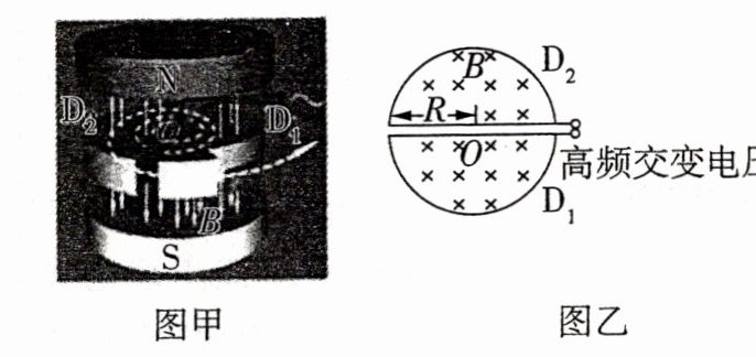 2.某型号的回旋加速器的工作原理如图甲所示,图乙为俯视图. 回旋加速器的核心部分为两个D形盒,分别为$D_1$、$D_2$. D形盒装在真空容器里,整个装置放在巨大的电磁铁两极之间的强大磁场中,磁场可以认为是匀强磁场,且与D形盒底面垂直. 两盒间的狭缝很小,带电粒子穿过狭缝的时间可以忽略不计. D形盒的半径为$R$,磁场的磁感应强度为$B$. 若质子从粒子源$O$处进入加速电场的初速度不计,质子质量为$m$、电荷量为$+q$. 加速器接入一定频率的高频交变电压,加速电压为$U$.(不考虑相对论效应和重力作用)