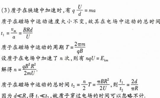 (3)若两D形盒狭缝之间距离为$d$,且$d\ll R$,计算质子在电场中运动的总时间$t_1$与在磁场中运动的总时间$t_2$,并由此说明质子穿过电场的时间可以忽略不计的原因.